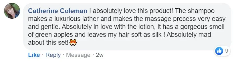 I absolutely love this product! The shampoo makes a luxurious lather and makes the massage process very easy and gentle. Absolutely in love with the lotion, it has a gorgeous smell of green apples and leaves my hair soft as silk ! Absolutely mad about this set!