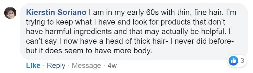 I am in my early 60s with thin, fine hair. I?m trying to keep what I have and look for products that don?t have harmful ingredients and that may actually be helpful. I can?t say I now have a head of thick hair- I never did before- but it does seem to have more body.